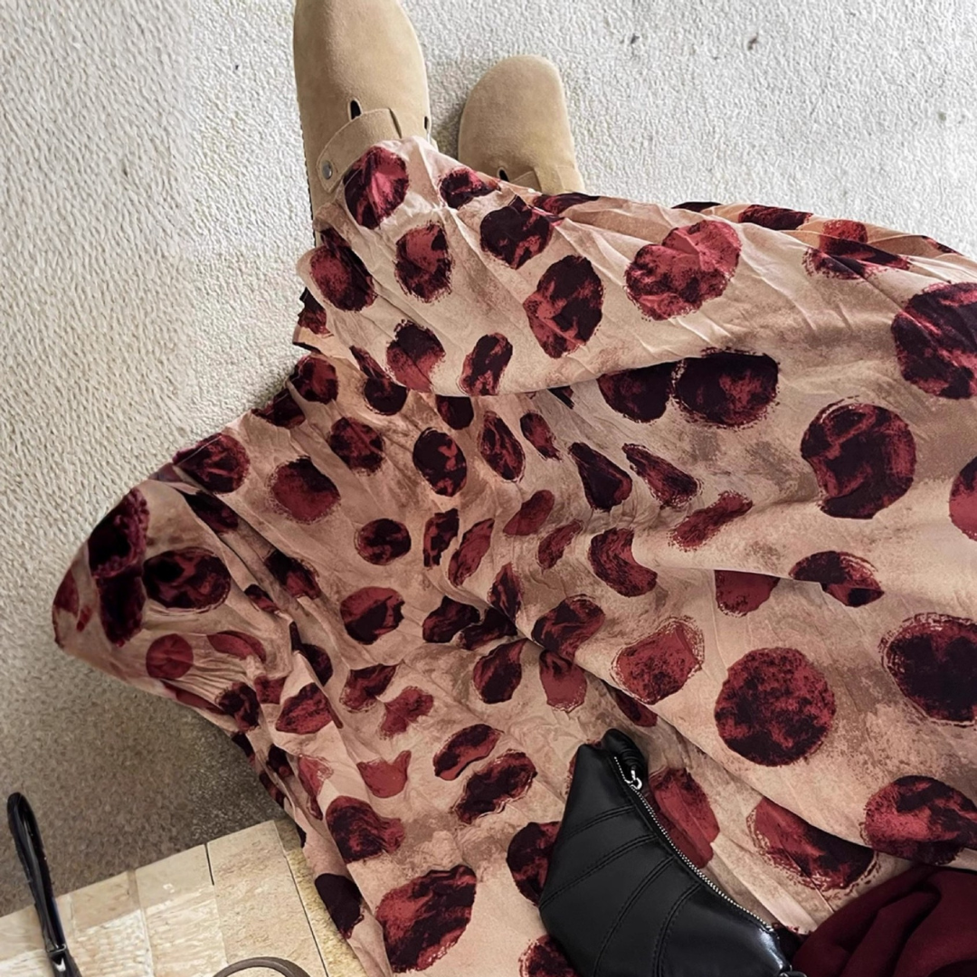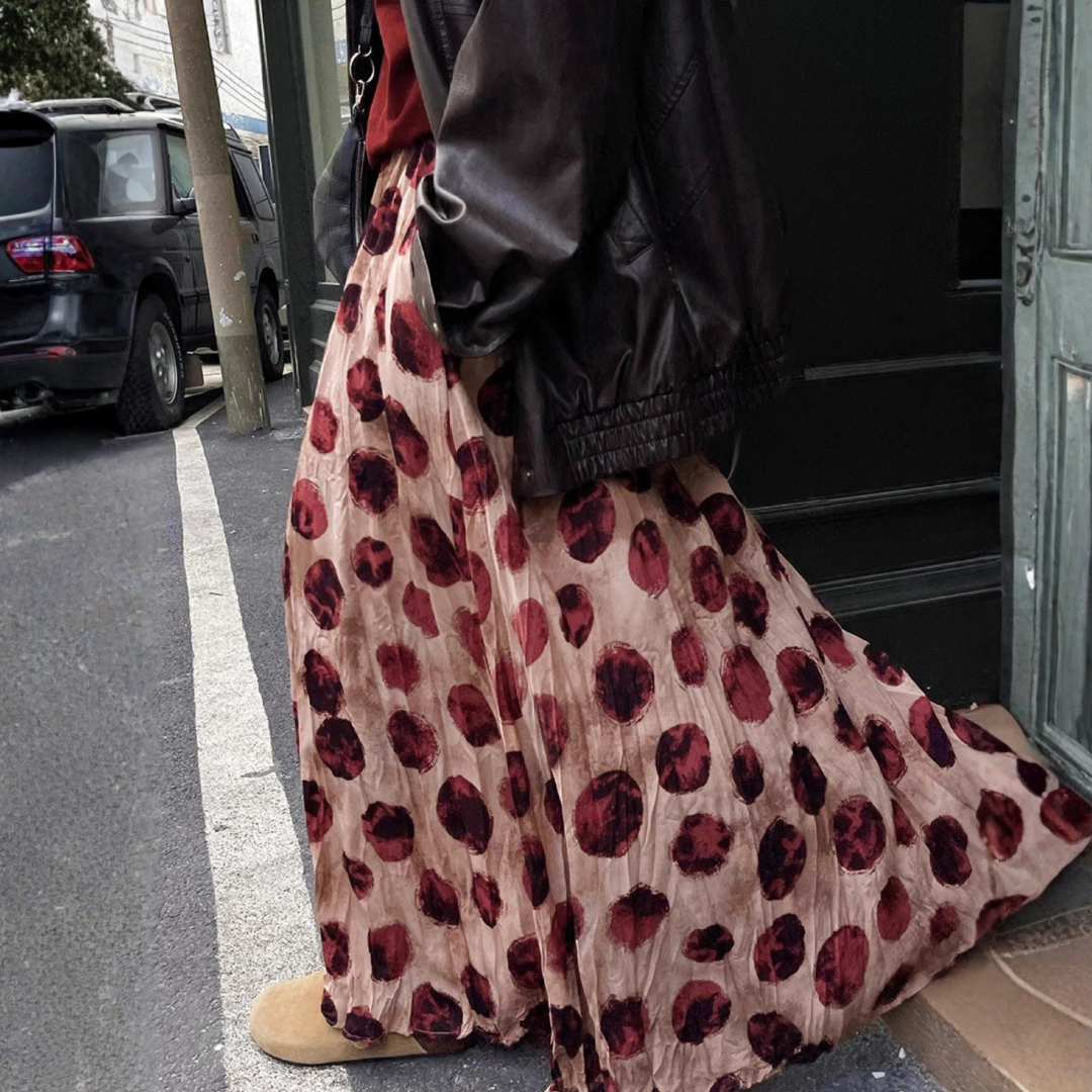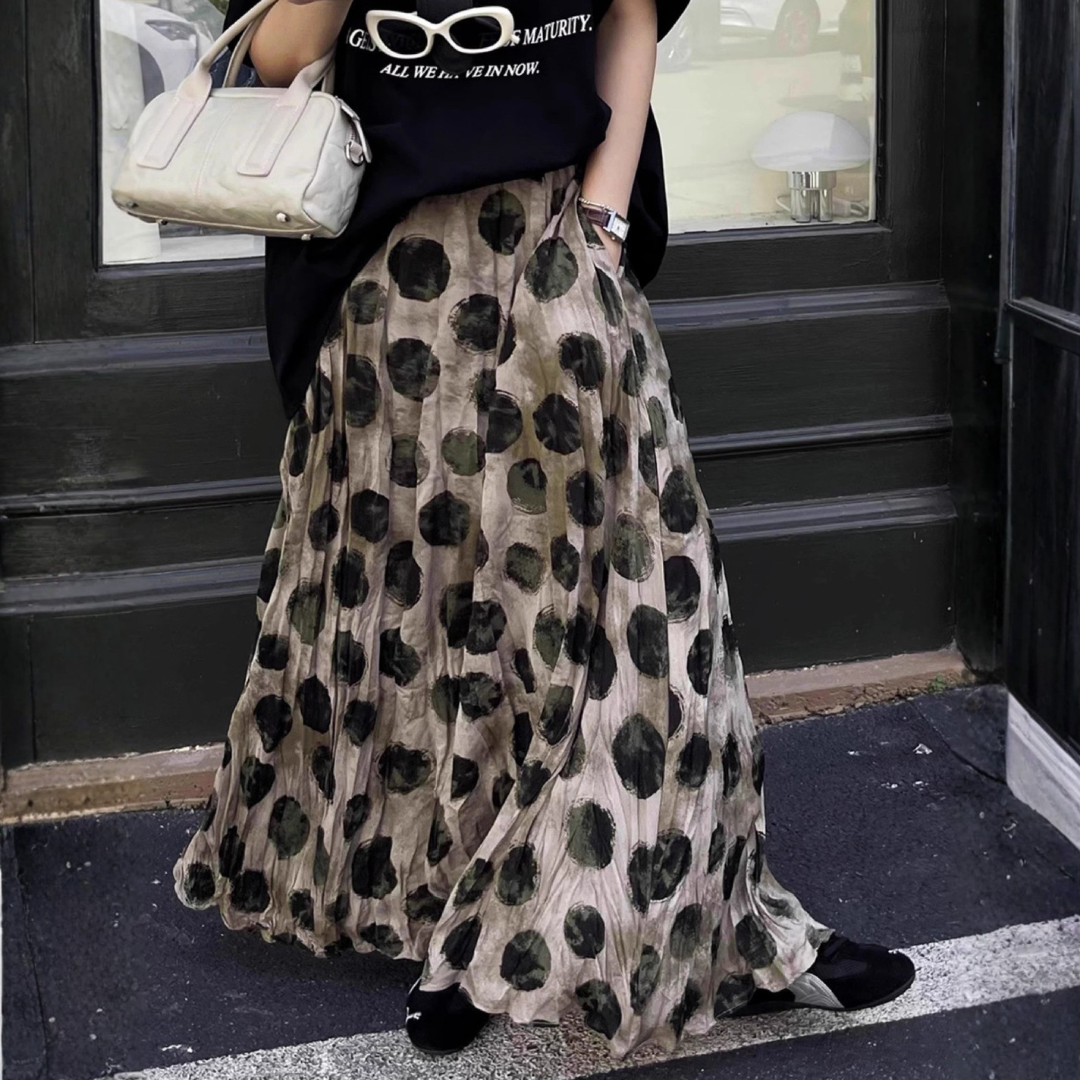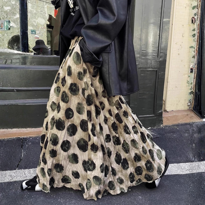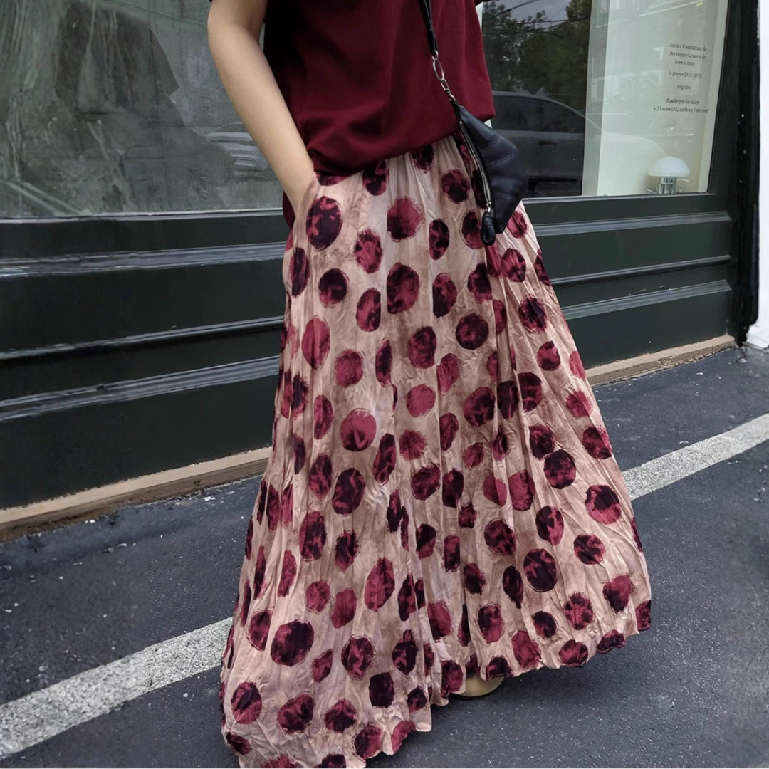Product Description: This statement maxi skirt features a unique hand-painted brushstroke polka print, designed with a flowy oversized silhouette that moves beautifully with every step. The pleated texture creates natural volume while keeping the look effortlessly slimming, perfect for women who love low-key yet high-impact style.