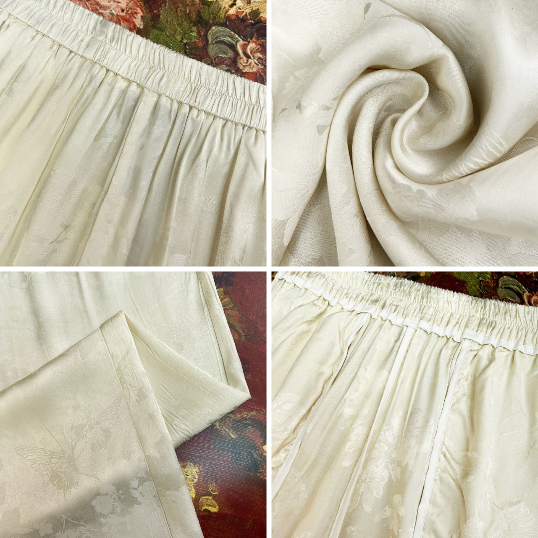- One Size: Waist: 64 (flat, elastic stretch), Length: Up to 91 (irregular hem)
