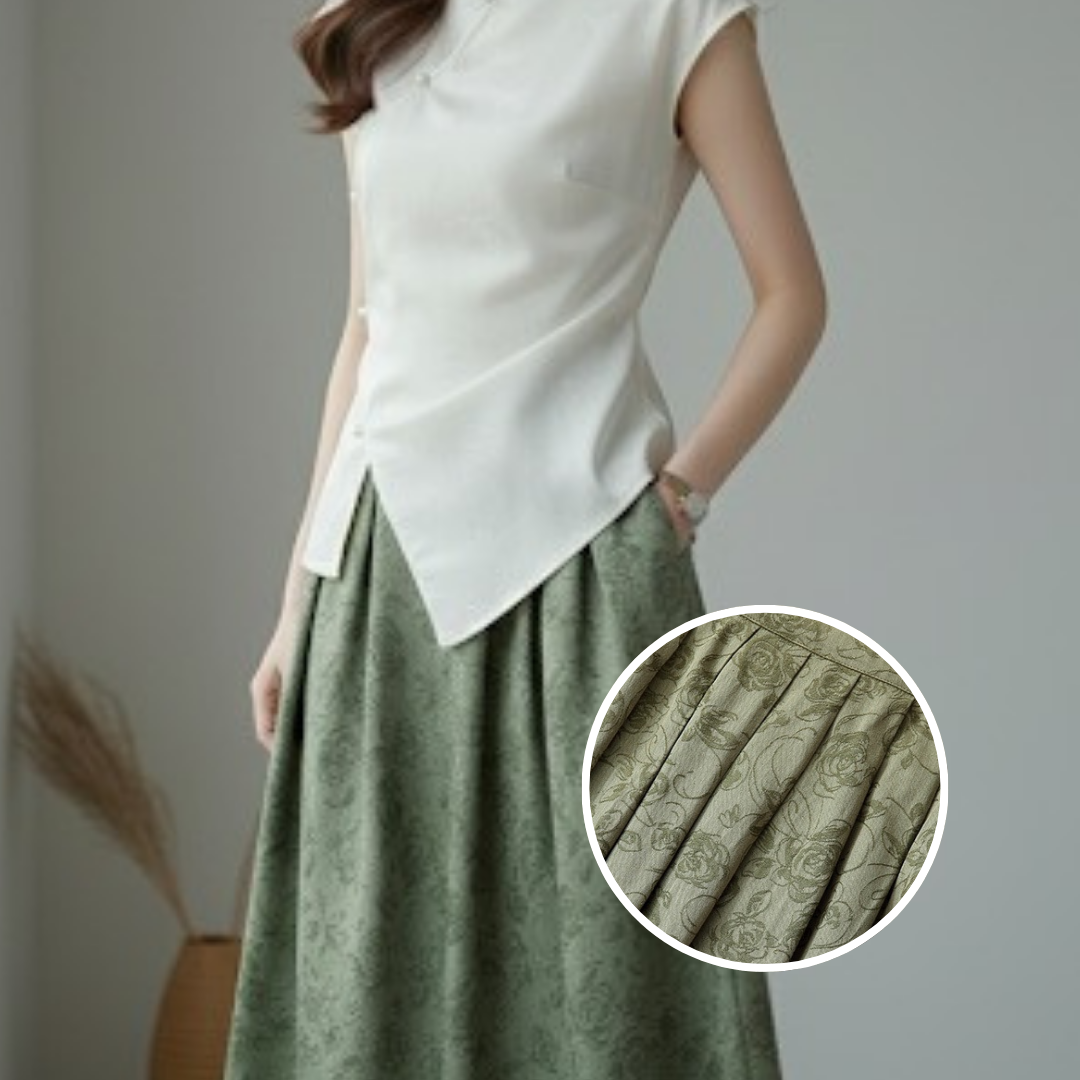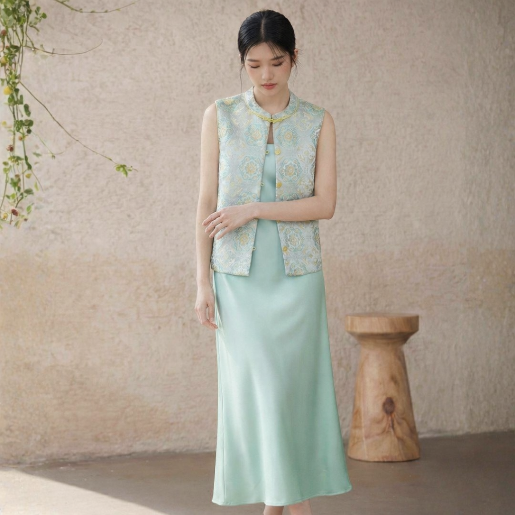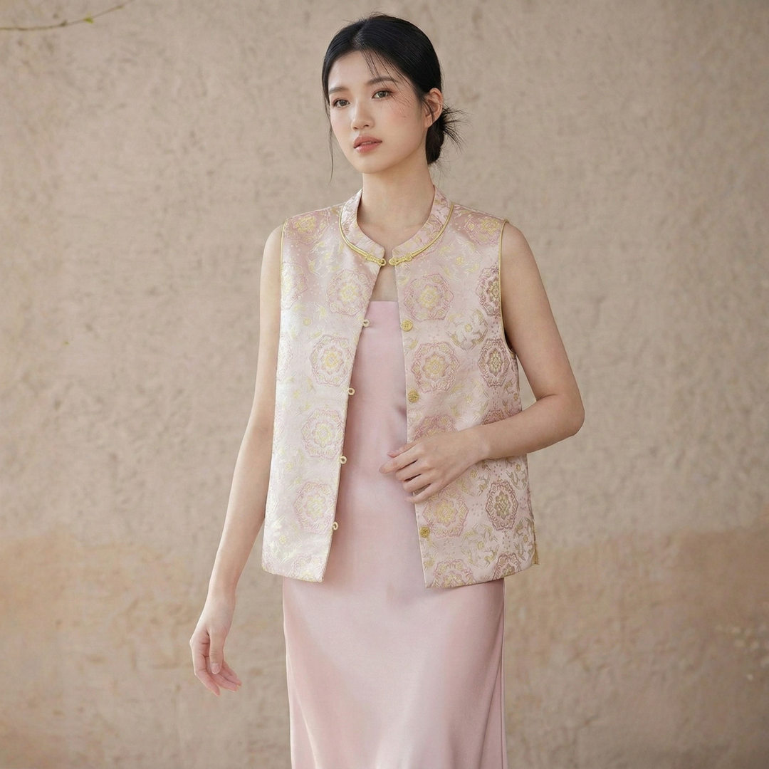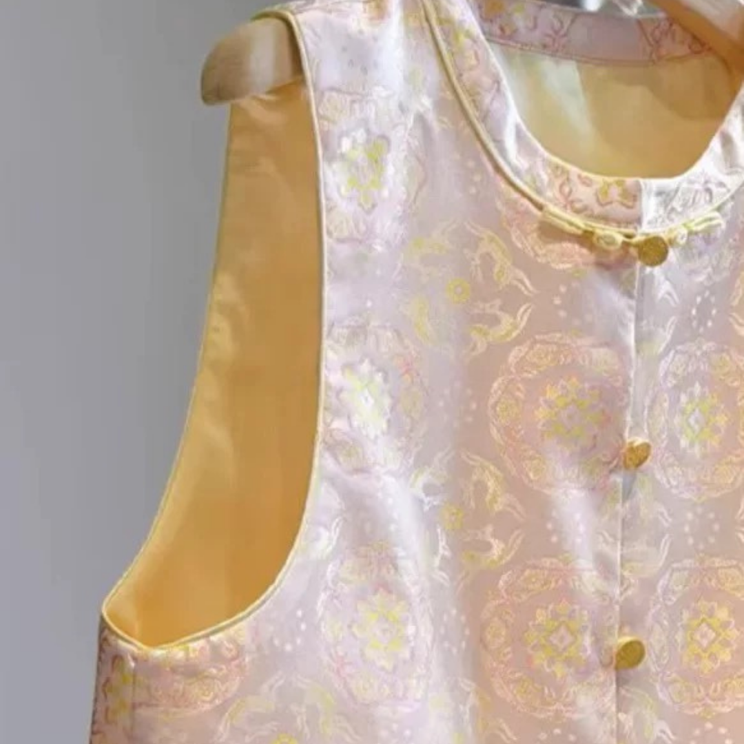 Product Description: The Golden Fortune Harmony Vest blends timeless Chinese elegance with modern minimalism. Crafted from luxurious jacquard fabric with a rich golden sheen, this sleeveless vest features handcrafted traditional frog buttons and a refined mandarin collar, creating a look that is both culturally rooted and effortlessly chic.Designed in a flattering tailored silhouette with a slightly cropped length, it pairs beautifully with satin skirts, wide-leg pants, or camisole dresses. The vest and skirt are sold separately.