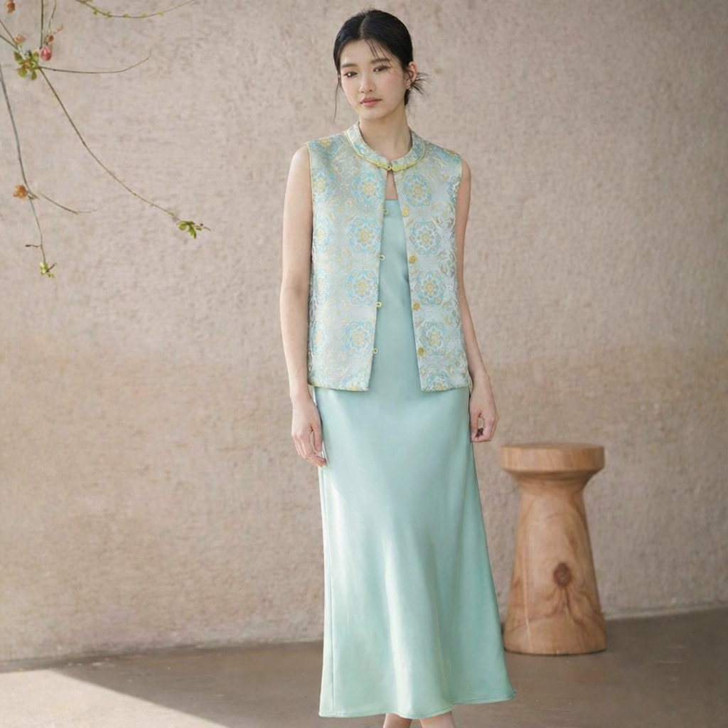 金瑞和合盘扣马甲/ 缎面醋酸丝滑半身裙 Golden Fortune Harmony Vest / Silky Acetate Midi Skirt