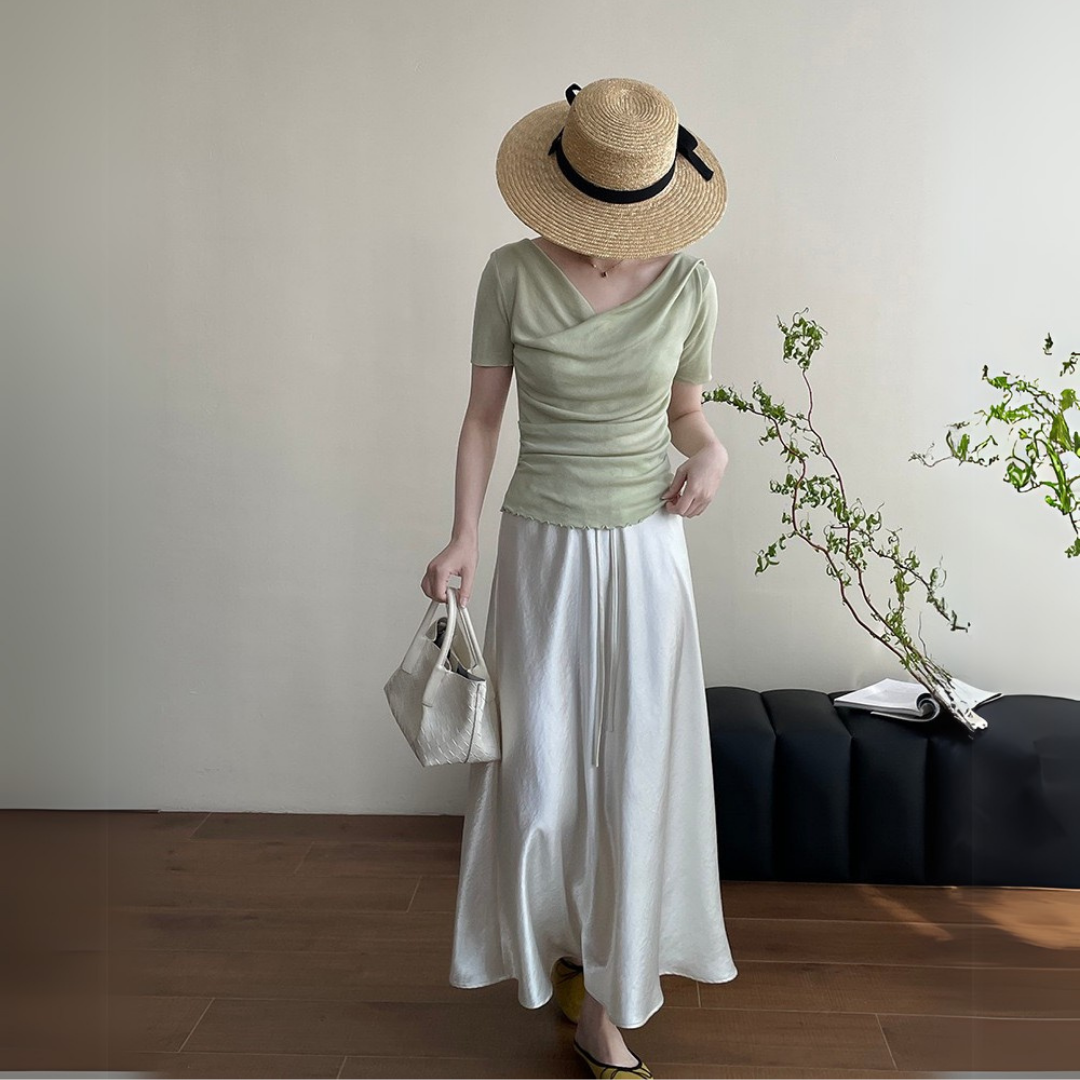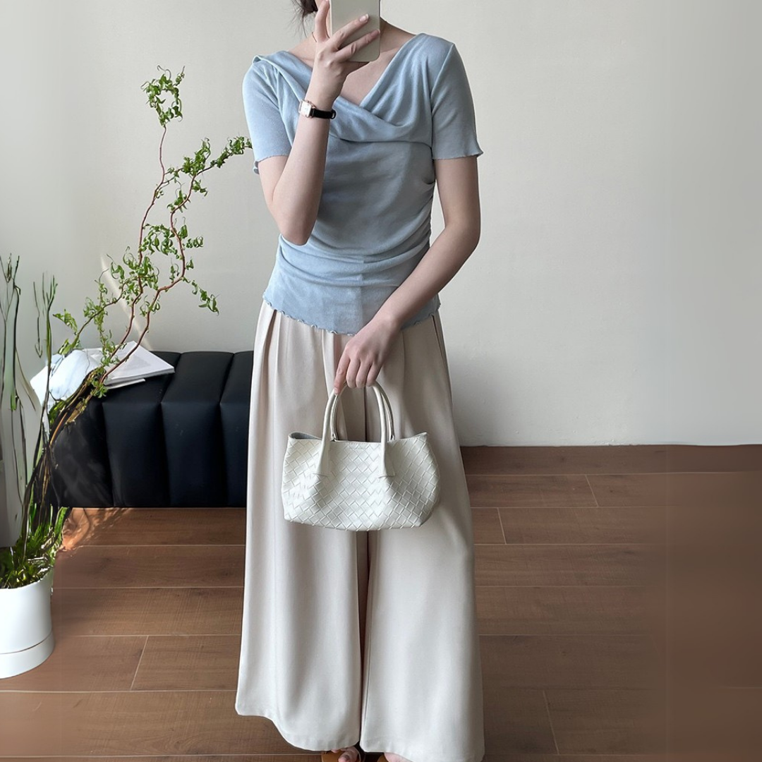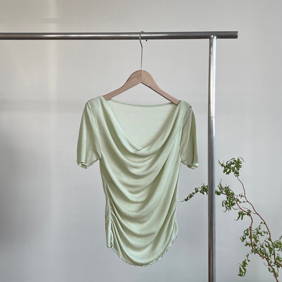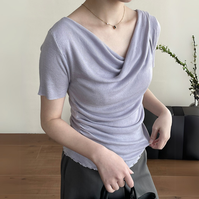 Product Description: This elegant short-sleeve top features a soft draped neckline that enhances your natural silhouette with a flattering, feminine touch. Designed with subtle ruching along the sides and delicate lettuce-edge trimming at the hem, this piece blends softness with understated charm. The fabric has light stretch and a smooth, cool texture—perfect for warm days.