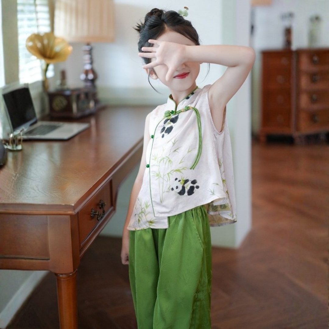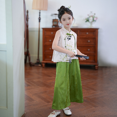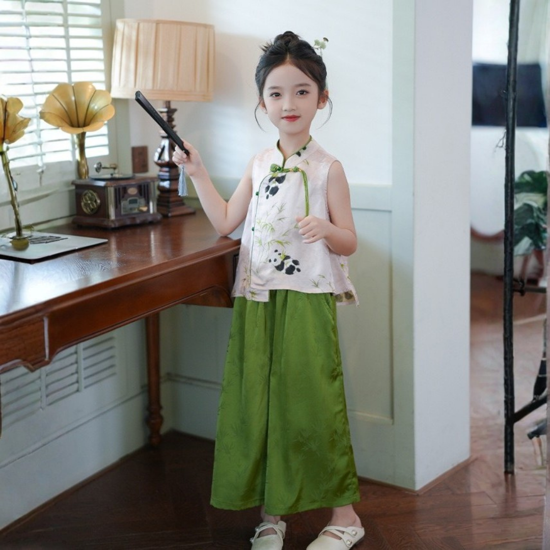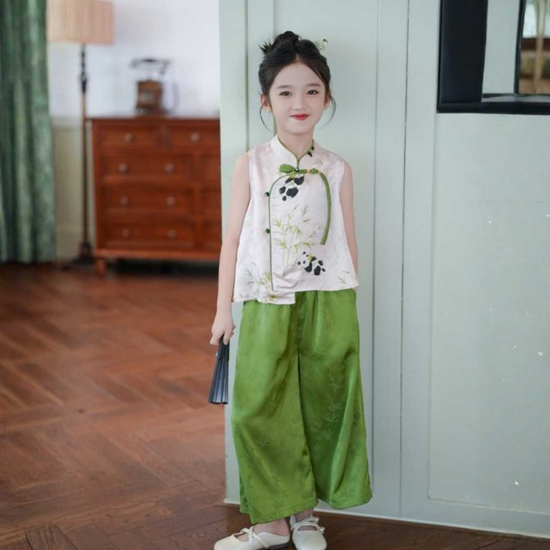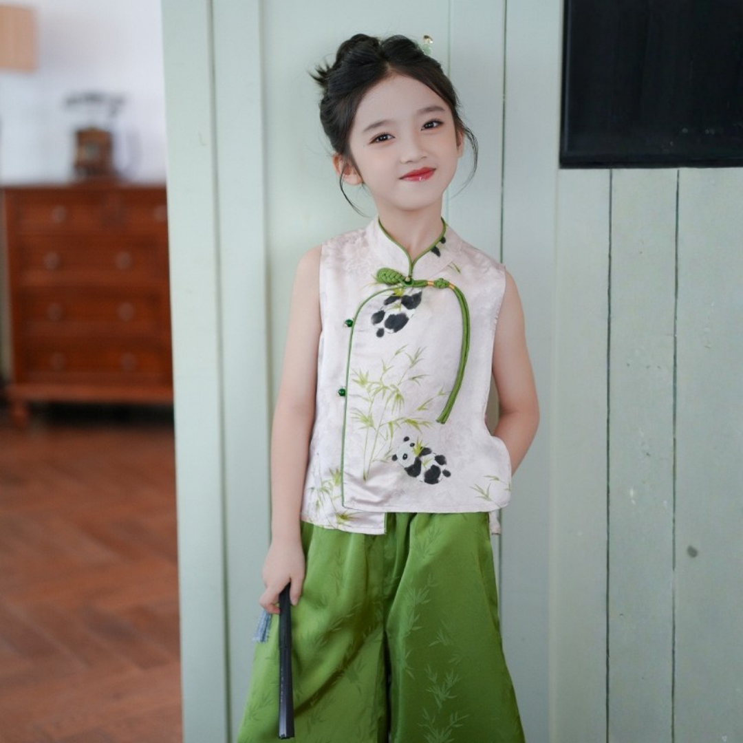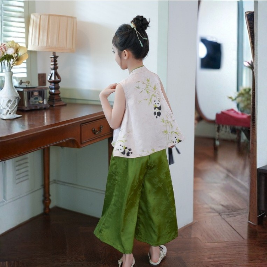 Product Description: This charming Bamboo Panda Sleeveless Hanfu Set captures the essence of oriental elegance with a playful modern twist. The sleeveless top features a traditional mandarin collar and side frog button design, beautifully adorned with bamboo and panda prints that symbolize purity and vitality. Paired with wide-leg satin trousers in fresh bamboo green, this outfit offers both comfort and refined style.